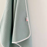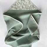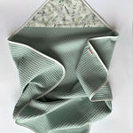 Our cotton waffle towel with hood will keep your baby warm after bath time and make it easy to dry the hair. The soft waffle towel makes a perfect cover and dries the delicate skin without causing irritation. This cotton towel dries fast and absorbs water perfectly.
