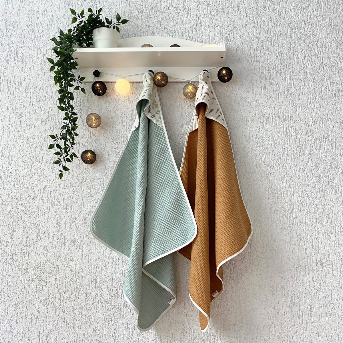 The hooded towel measures 72x72cm for babies and 100x100cm for toddlers. Our soft waffle cotton towel is made of 100% natural cotton. Perfect for daily use and it will look beautiful as a decor in your bathroom.
