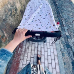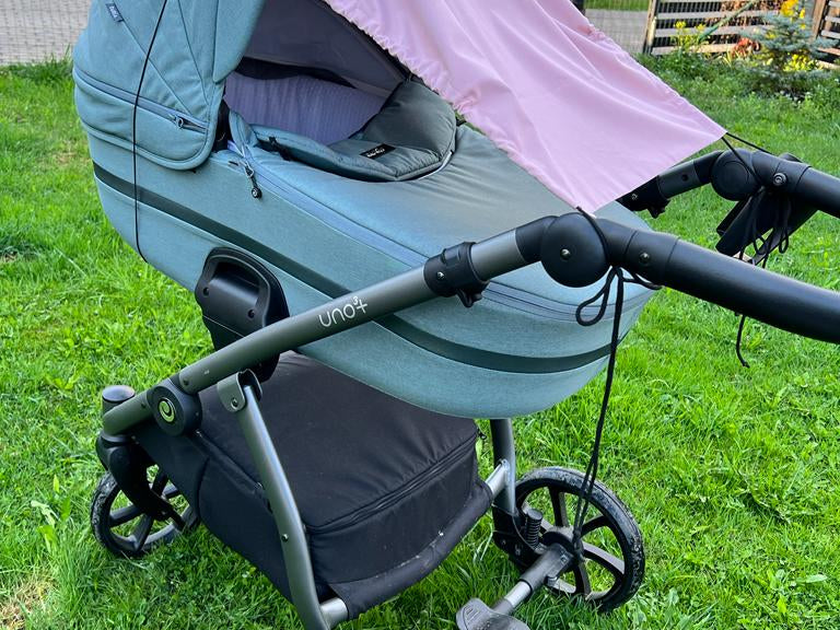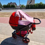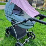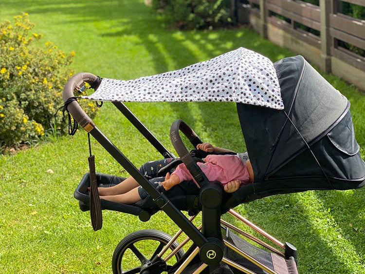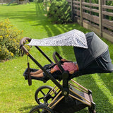 Double layered cotton for best sun, sleep and natural UV protection. The parasol is fitted with rubber band with a plastic lock to be stretched over the canopy of the stroller or car seat and two lateral cords which can be attached to the handle. The awning simply slides back alongside the cords. It is suitable for prams, buggy’s, car seats and pushchairs with a hood.
